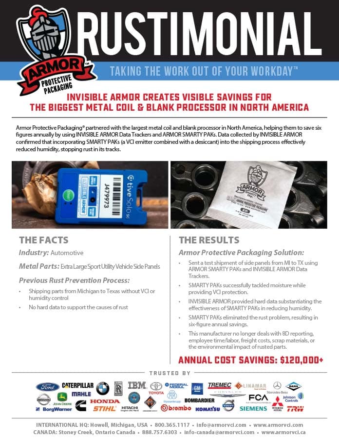 Armor Protective Packaging® partnered with the largest metal coil and blank processor in North America, helping them to save six  figures annually by using INVISIBLE ARMOR Data Trackers and ARMOR SMARTY PAKs. Data collected by INVISIBLE ARMOR confirmed that incorporating SMARTY PAKs (a VCI emitter combined with a desiccant) into the shipping process effectively reduced humidity, stopping rust in its tracks.
