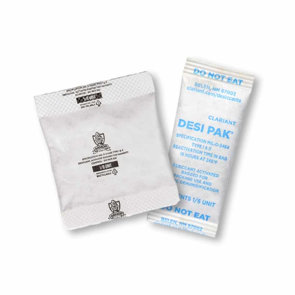 ARMOR SHIELD® Desiccant packs contain drying agents such as clay and silica gel that adsorb water and decrease moisture in an enclosed space. ARMOR offers desiccant in sewn cloth or puncture-resistant Tyvek® packaging in sizes that range from.5 grams to 2,500 grams. When sized and used properly, ARMOR SHIELD Desiccant will reduce and/or maintain the humidity level within your packaging, crate or container for an extended period of time.